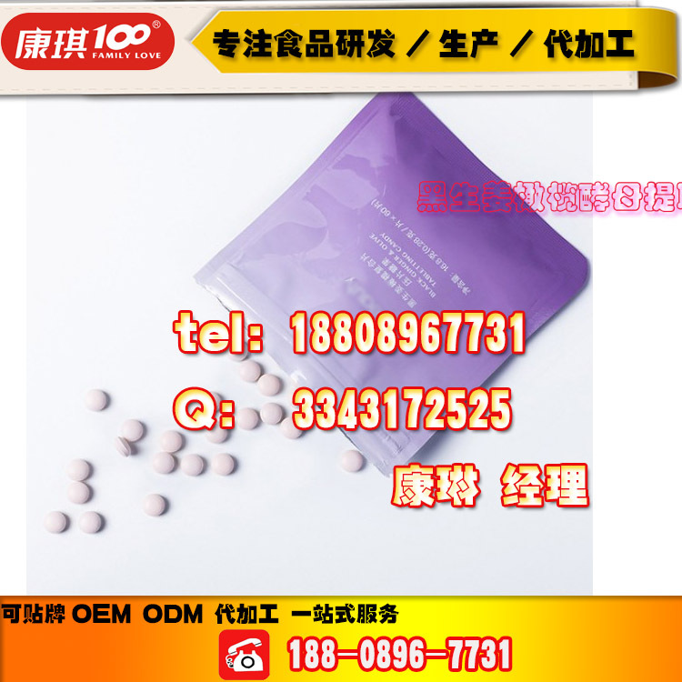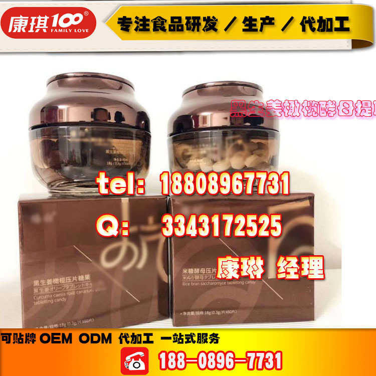 湖南康琪壹佰--提供安全、稳定、专业的产品!黑生姜橄榄酵母压片糖果ODM贴牌OEM代加工厂 一切从客户角度出发,用心服务,给客户提供好销售的产品配方,提高品牌市场竞争力,欢迎咨询洽谈,欢迎参观考察工厂。全国代工热线: 188-0896-7731(同v信) 康琳 经理 QQ:3343172525 vx号:Afine2003